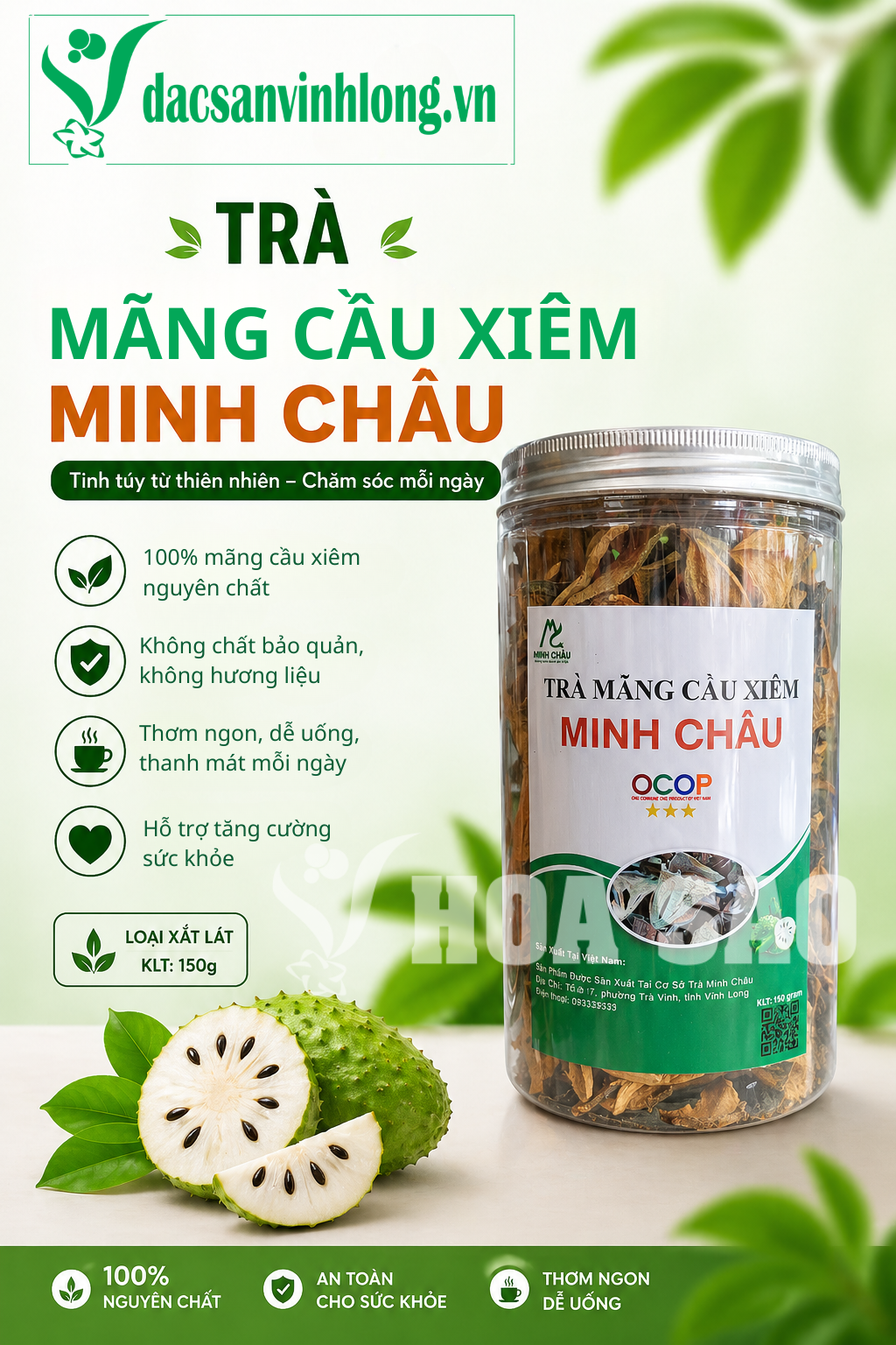Trà Mãng Cầu Xiêm Minh Châu được chế biến từ 100% trái mãng cầu xiêm được trồng tại Trà Vinh. Sản phẩm được rang thủ công kết hợp với công nghệ sấy hiện đại giữ trọn hương vị tự nhiên, thanh mát.